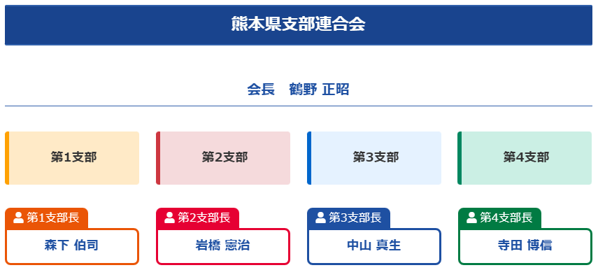 熊本県支部連合会 支部構成 2023.07.292025.02.05 第1支部第2支部第3支部第4支部熊本市中央区熊本市西区山鹿市美里町熊本市東区熊本市南区菊池市氷川町熊本市北区荒尾市合志市八代市玉名市大津町五木村和水町菊陽町水上村南関町阿蘇市芦北町長洲町小国町球磨村玉東町南小国町山江村産山村相良村南阿蘇村湯前町高森町多良木町西原村あさぎり町益城町錦町山都町人吉市御船町水俣市甲佐町津奈木町嘉島町宇土市宇城市天草市上天草市苓北町