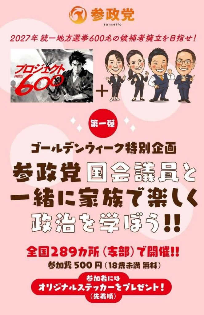 トップページ 2023.07.072026.03.07 【イベントリスト】 4月 26 9:50 AM - 11:50 AM 【第2支部 第4回目勉強会&ランチ会】川尻公会堂 4/26(日) 5月 4 2:45 PM - 4:45 PM [GW特別企画] 参政党国会議員と一緒に家族で楽しく政治を学ぼう!! in 熊本県熊本市中央区(熊本第1支部) 5月 5 9:45 AM - 11:45 AM [GW特別企画] 参政党国会議員と一緒に家族で楽しく政治を学ぼう!! in 熊本県熊本市西区(熊本第2支部) 5月 5 2:30 PM - 4:30 PM [GW特別企画] 参政党国会議員と一緒に家族で楽しく政治を学ぼう!! in 熊本県八代市新町(熊本第4支部) 5月 6 10:00 AM - 12:00 PM [GW特別企画] 参政党国会議員と一緒に家族で楽しく政治を学ぼう!! in 熊本県菊池郡大津町(熊本第3支部) カレンダーを表示 【赤坂NEWS】 【お知らせ】 New 【満員御礼のお知らせ】「日本人ファーストプロジェクト」in 熊本 2026.03.01 【衆議院選挙2026】12日間の戦い 〜熊本〜 2026.02.14 【2026年3月1日】参政党全国タウンミーティング企画『日本人ファーストプロジェクト』熊本開催のお知らせ 2026.01.04 【2025年9月14日】参政党タウンミーティング『グローバリズムと日本の安全保障』&『候補者募集説明会(九州ブロック)』のご報告 2025.09.17 【2025年9月1日】八代市議会議員選挙『小川たかし』氏トップ当選! 2025.09.02 もっと見る 【仲間を募集中!】 参政党に参加する! 【行政】
