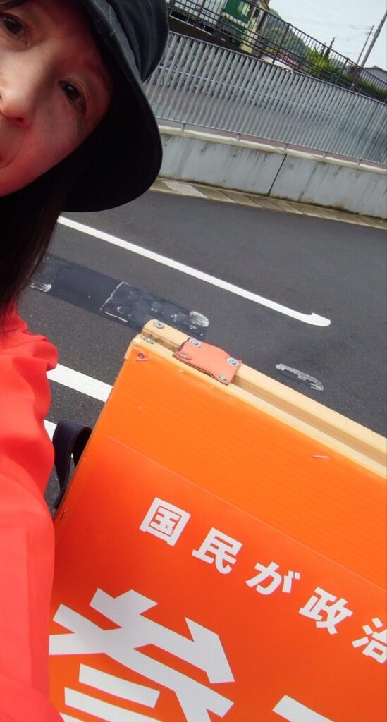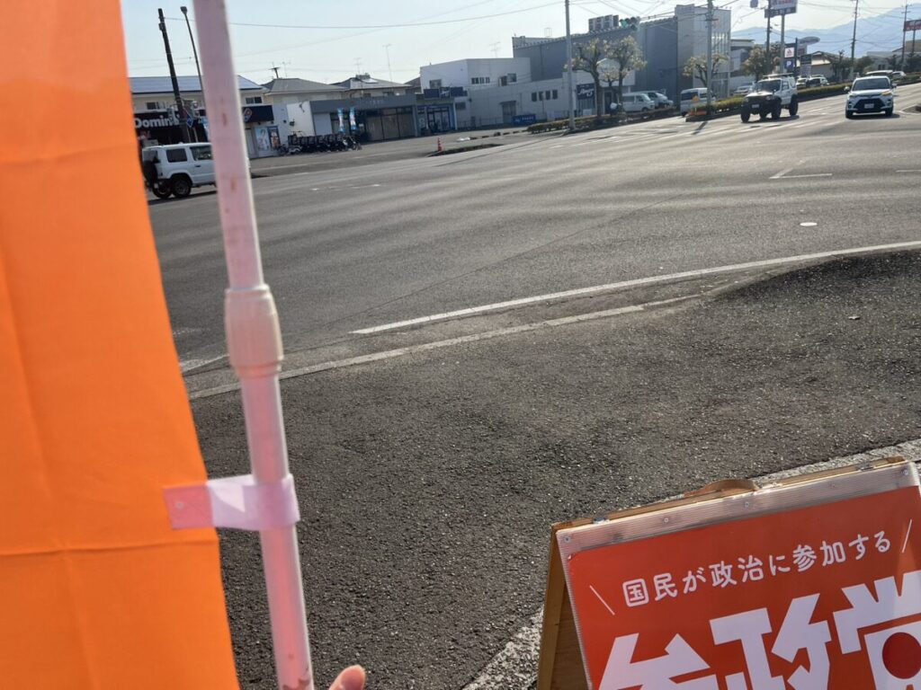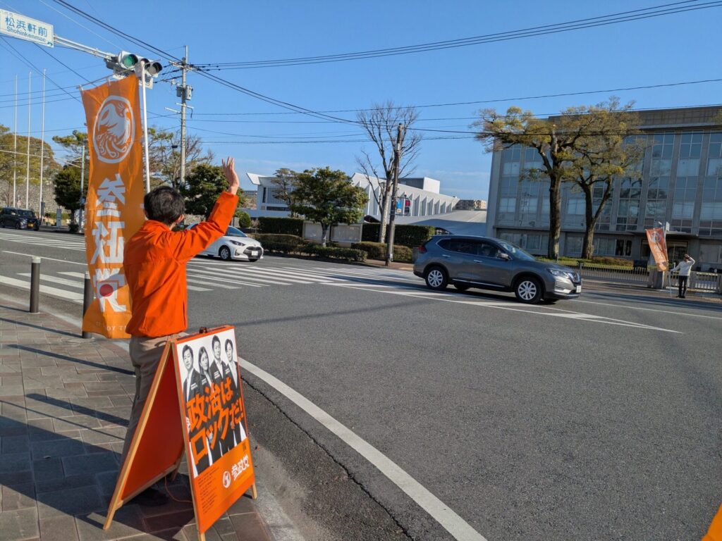 車からはだーれも手を振ってくれないけど、将来の有権者(学生)に向けて絶賛アピール中!