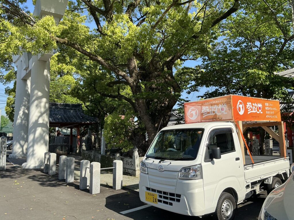新街宣車と八代神社(妙見宮)
