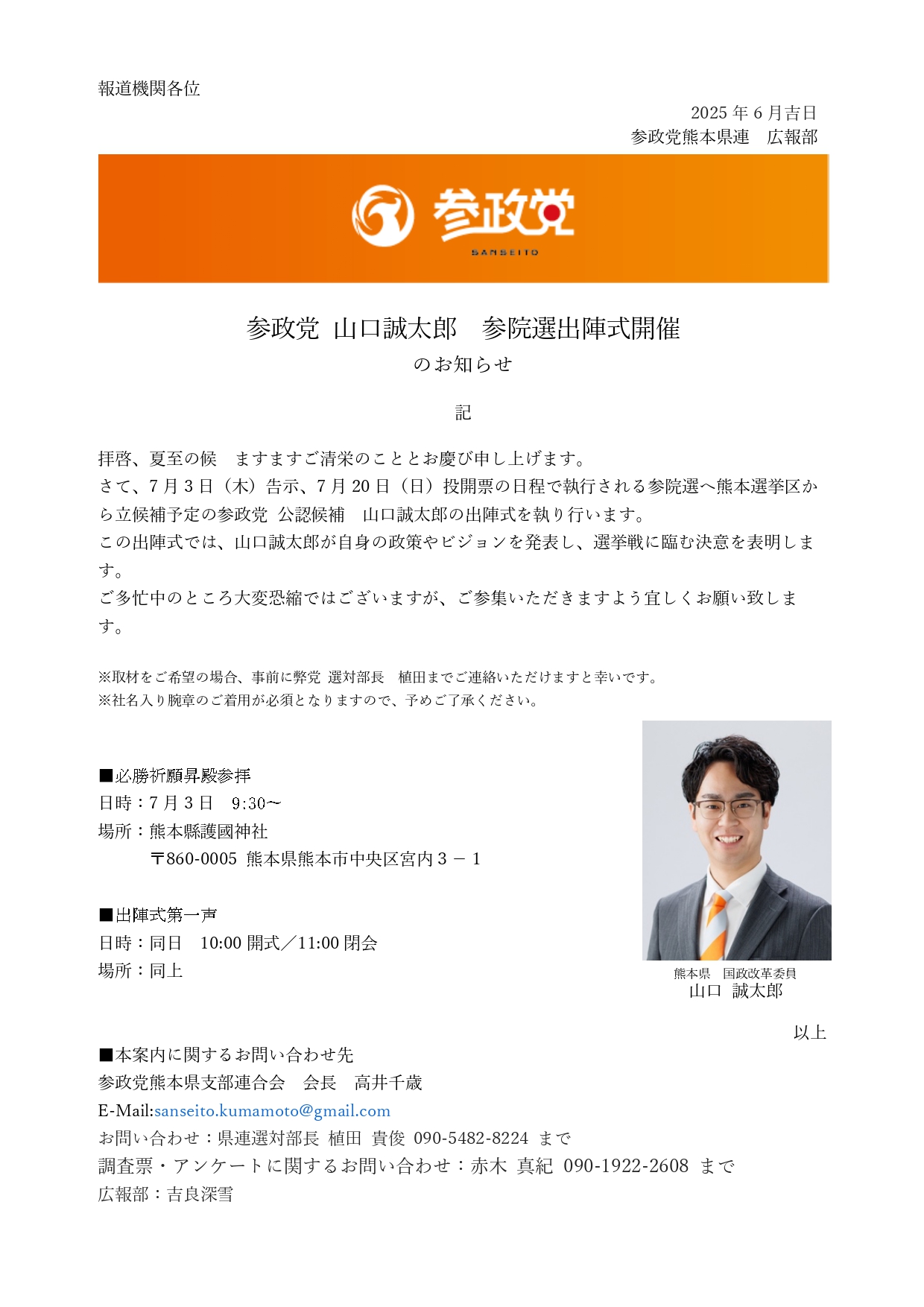 【プレスリリース】参政党 山口誠太郎 参院選出陣式開催のお知らせ