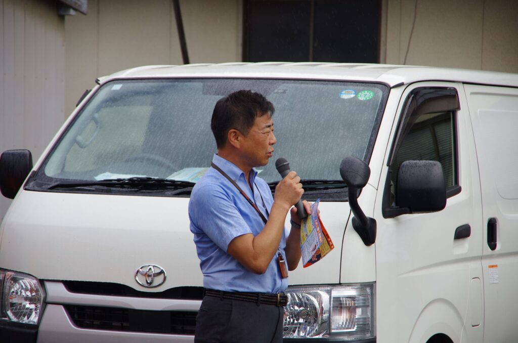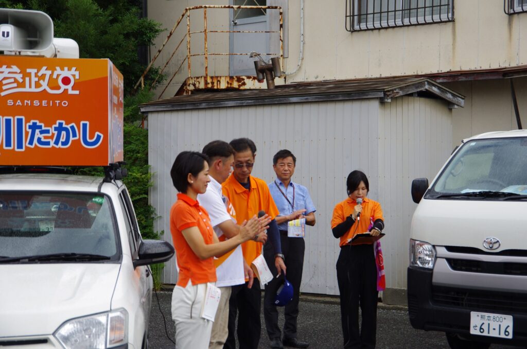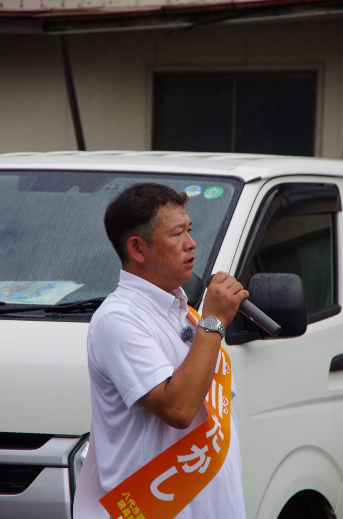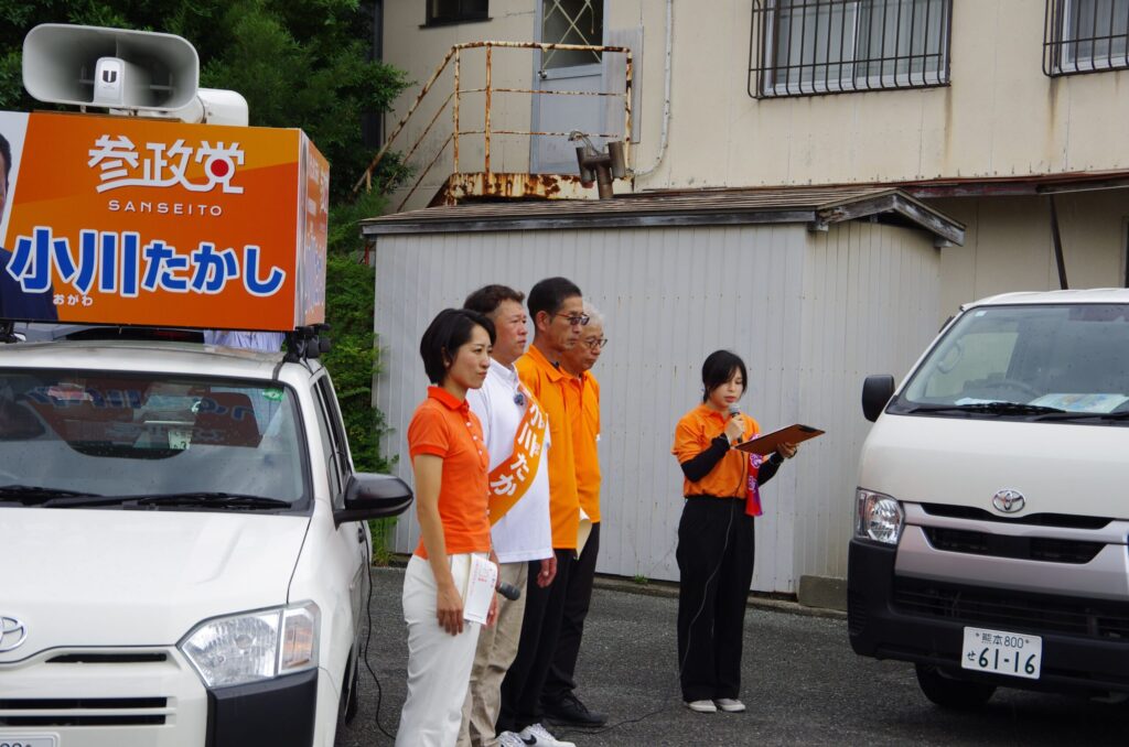 ご来賓として、福岡市議会議員の「新開ゆうじ」氏からもご挨拶をいただきました。新開氏は「今回の八代市の選挙は参政党にとって重点地域であり、全国の同志も注目している」と述べられ、小川候補への力強い支援を呼びかけました。