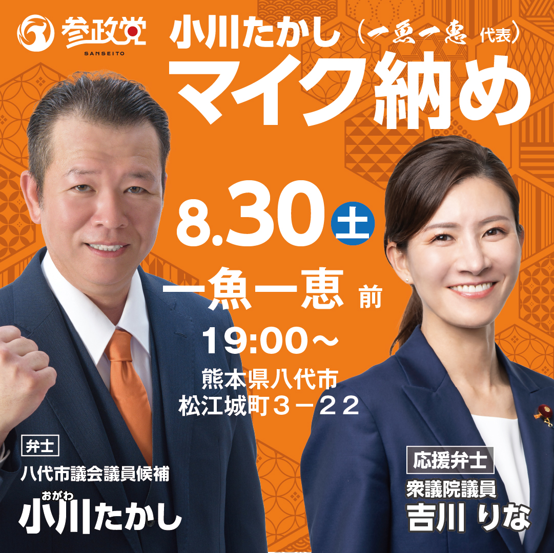 8月29日(金)には、「あんどう裕」参議院議員をお迎えして個人演説会、8月30日(土)は、「吉川りな」衆議院議員をお迎えしての「マイク納め」を行います。