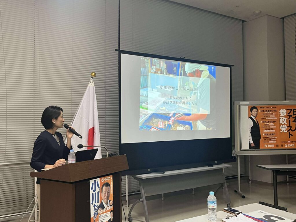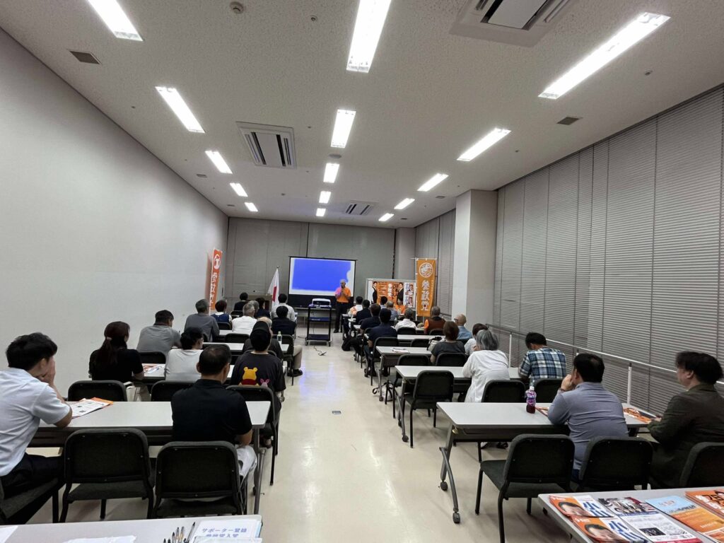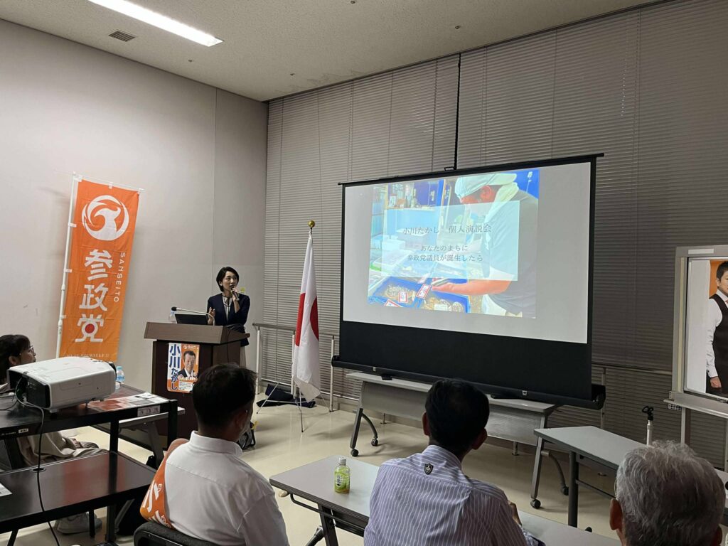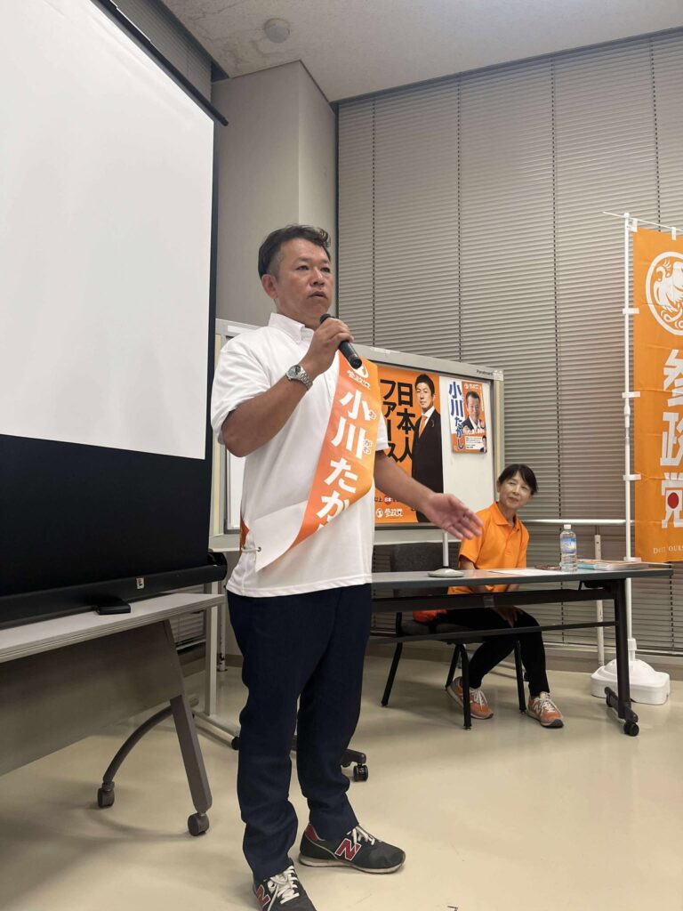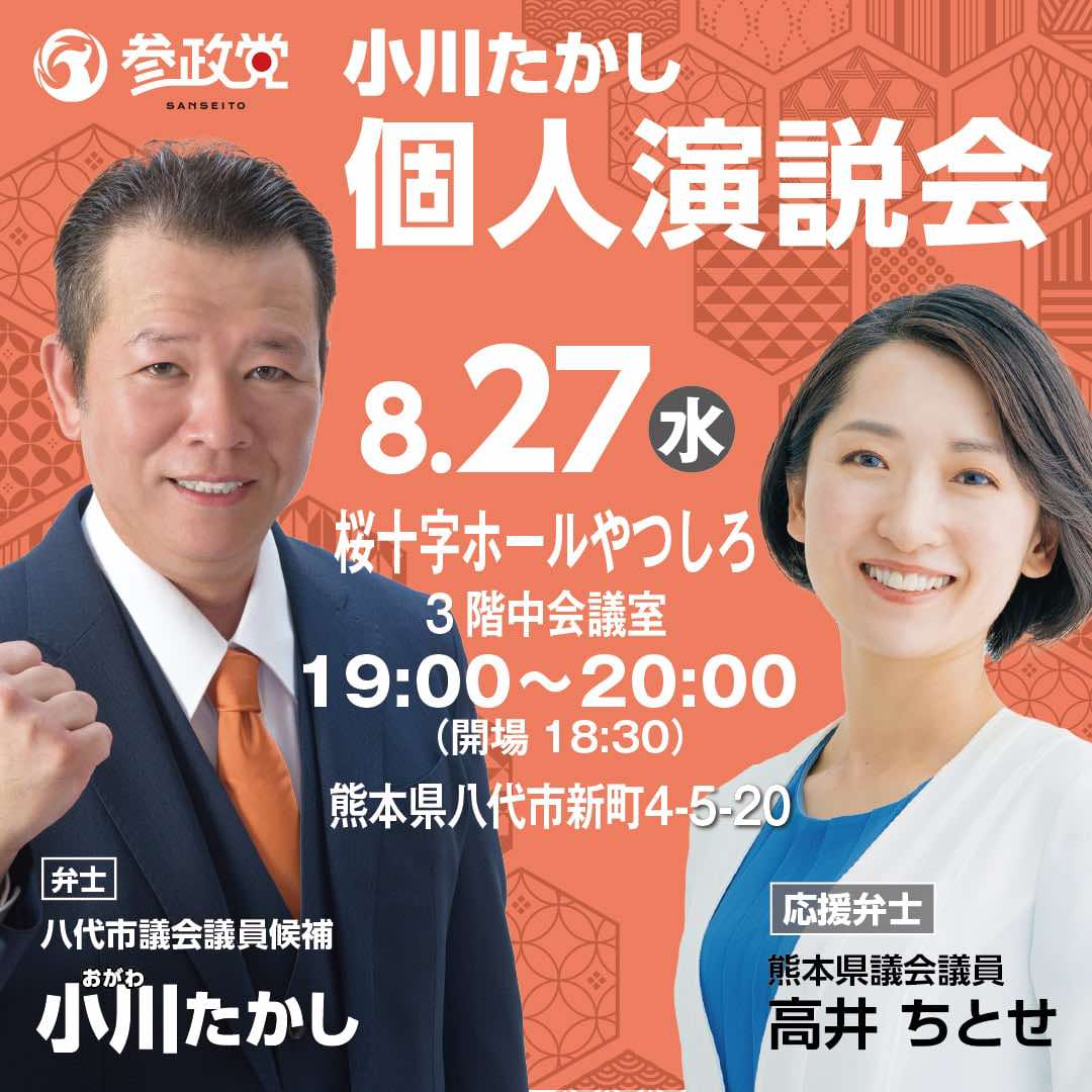 2025年8月27日(水)19時より「桜十字ホールやつしろ」にて「小川たかし」個人演説会が開催されました。