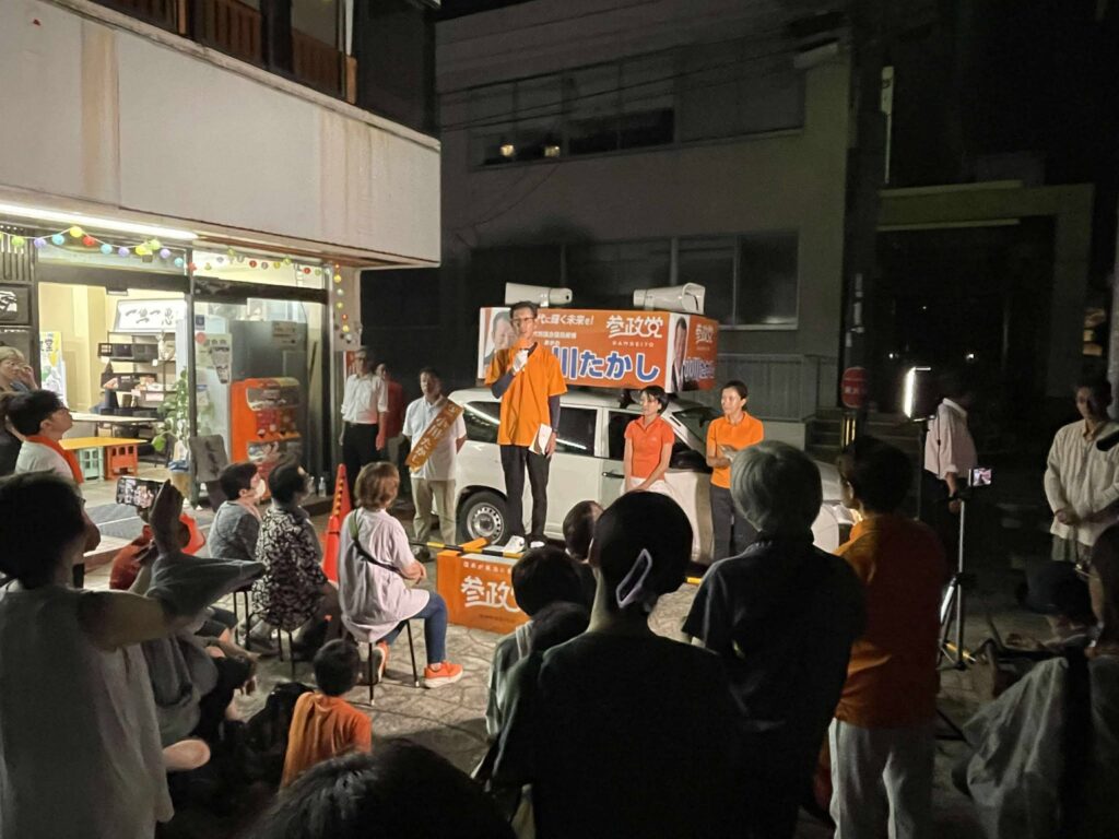 「参政党には組織票も団体票もない。一人ひとりの票がすべて」と訴え、必ず投票に行くよう強くお願いしました。「ここでこけるわけにはいかない。皆さんの力でスタートラインに立たせてください」と力を込めました。