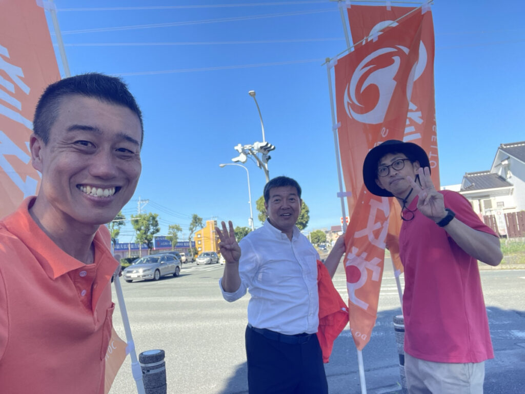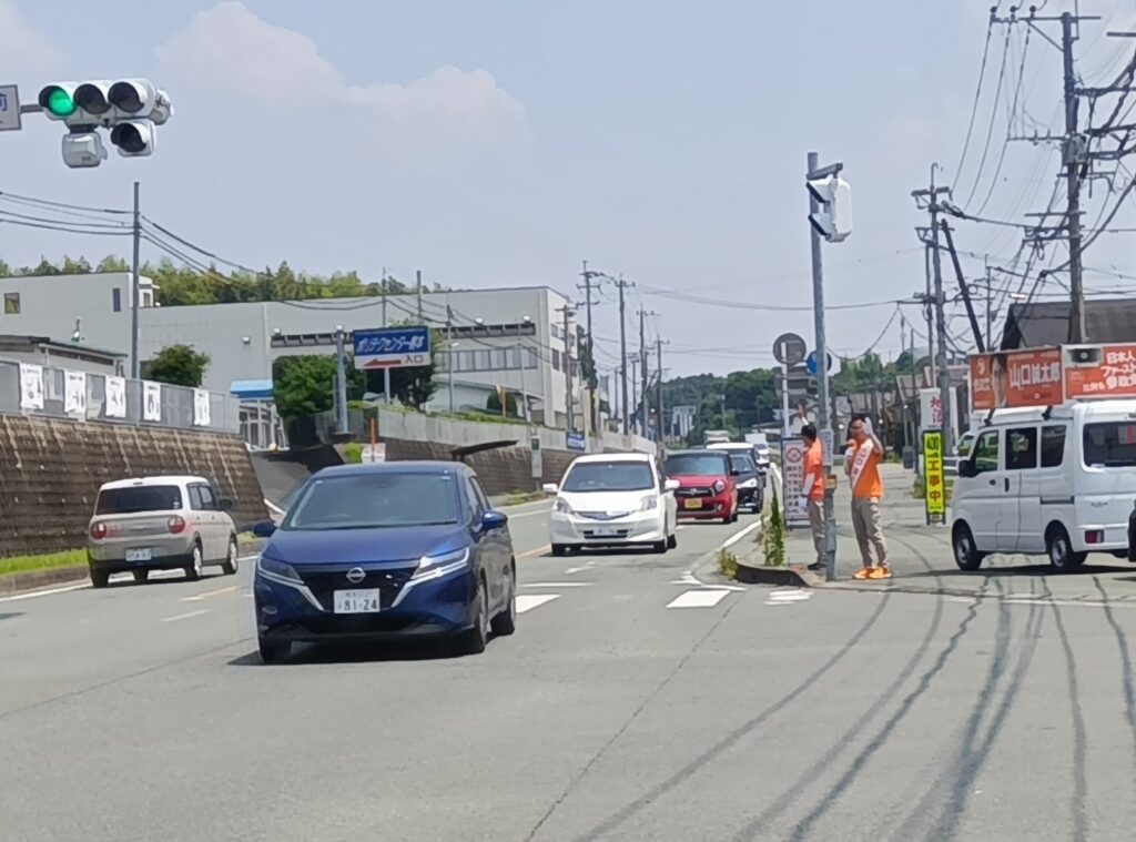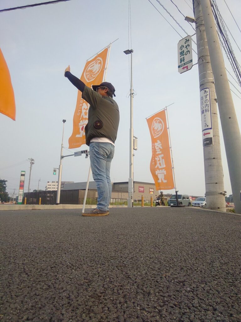 7:30〜8:30 菊陽町石坂交差点にて靏野さん、つる田さんと3人で辻立ち・街頭演説を行いました。