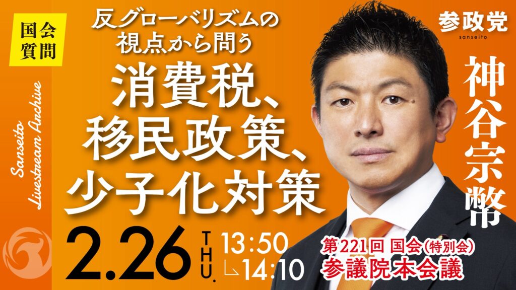 【国会中継アーカイブ】2026年2月 X Facebook はてブ LINE LinkedIn コピー 2026.02.27 「消費税、移民政策、少子化対策」参議院議員 神谷宗幣 「旧氏使用法案、消費税減税を問う」衆議院議員 和田政宗