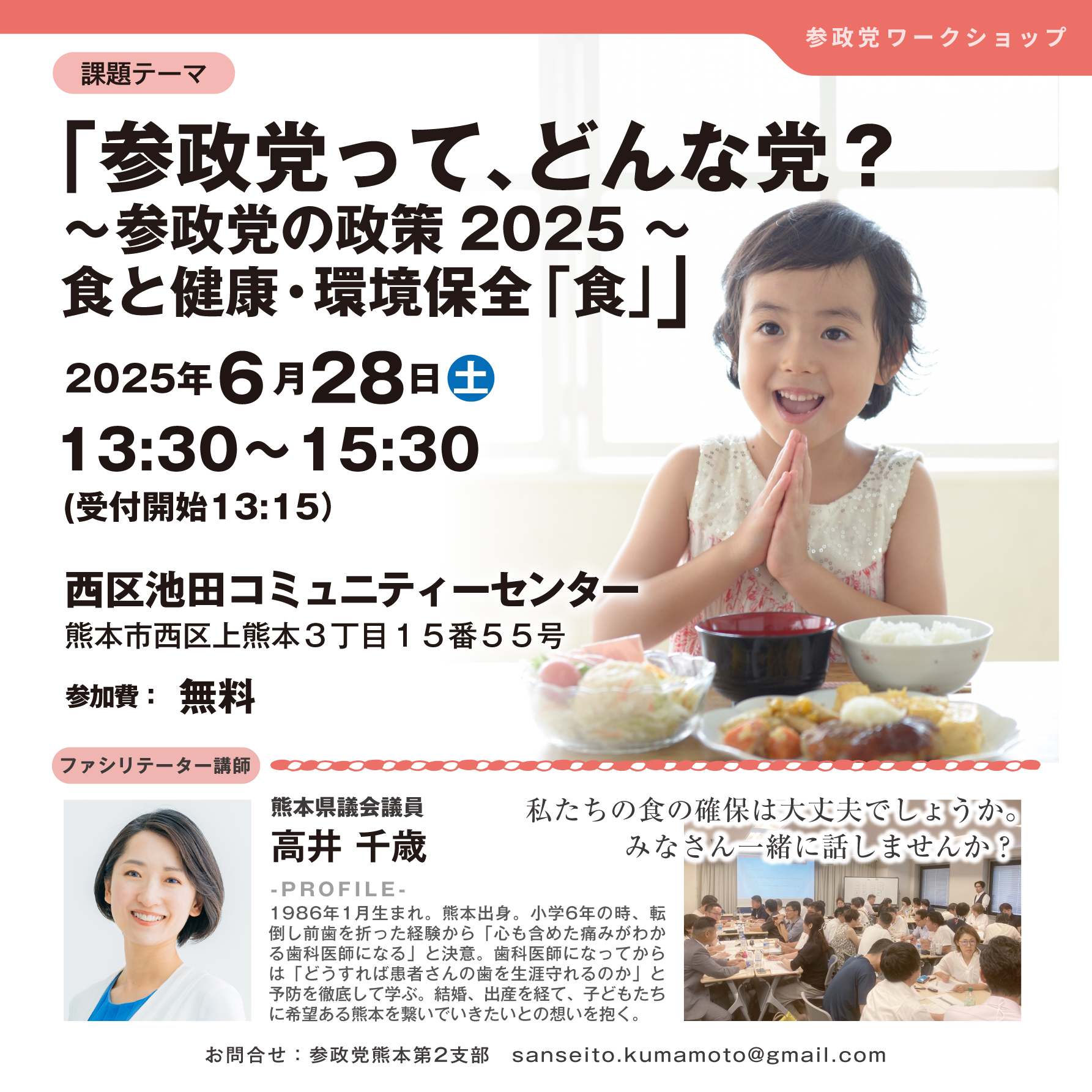 【2025年6月28日熊本市西区開催】参政党って、どんな党?~参政党の政策2025~食と健康・環境保全「食」
