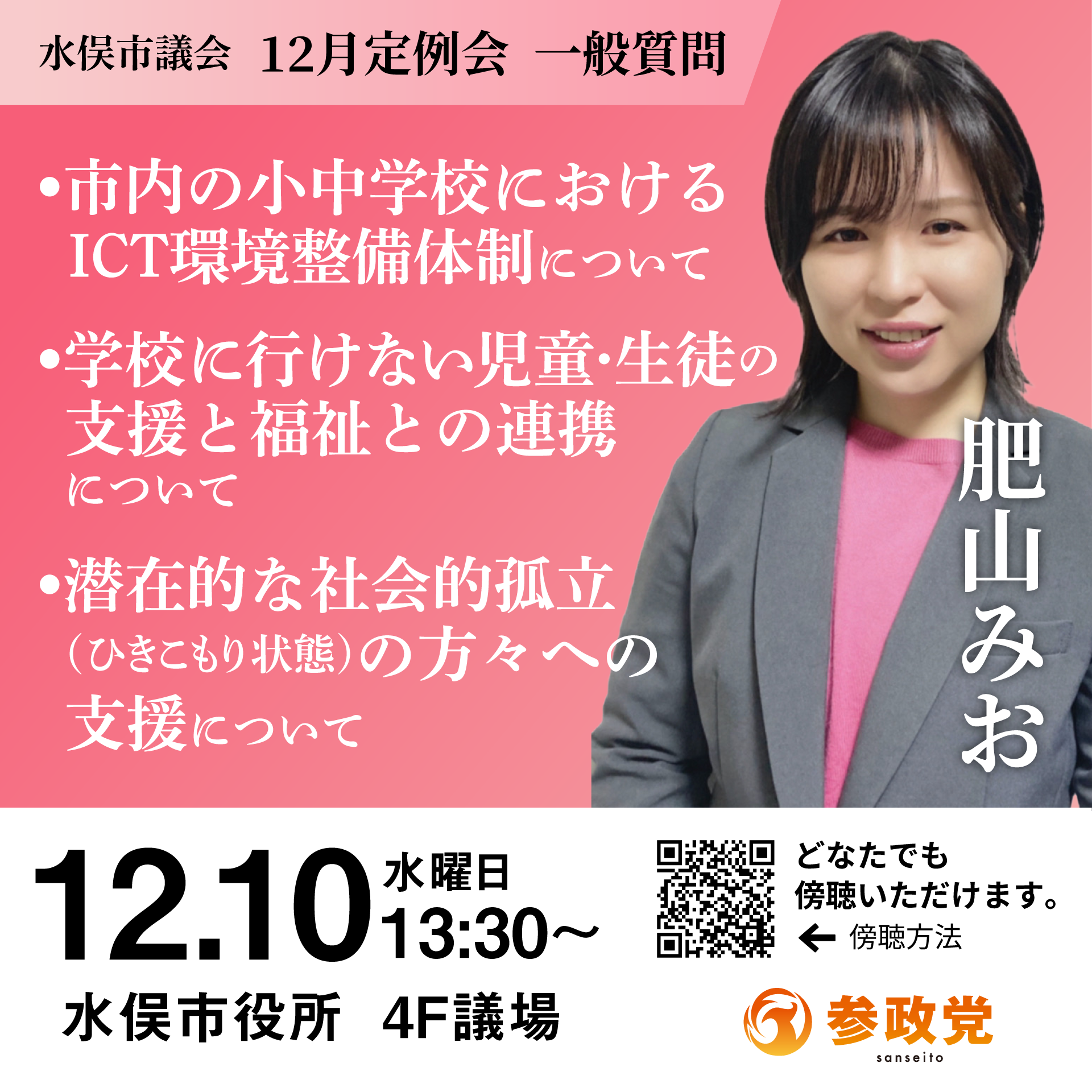 【水俣市議会】12月10日(水) 13:30〜 肥山みお議員一般質問のお知らせ