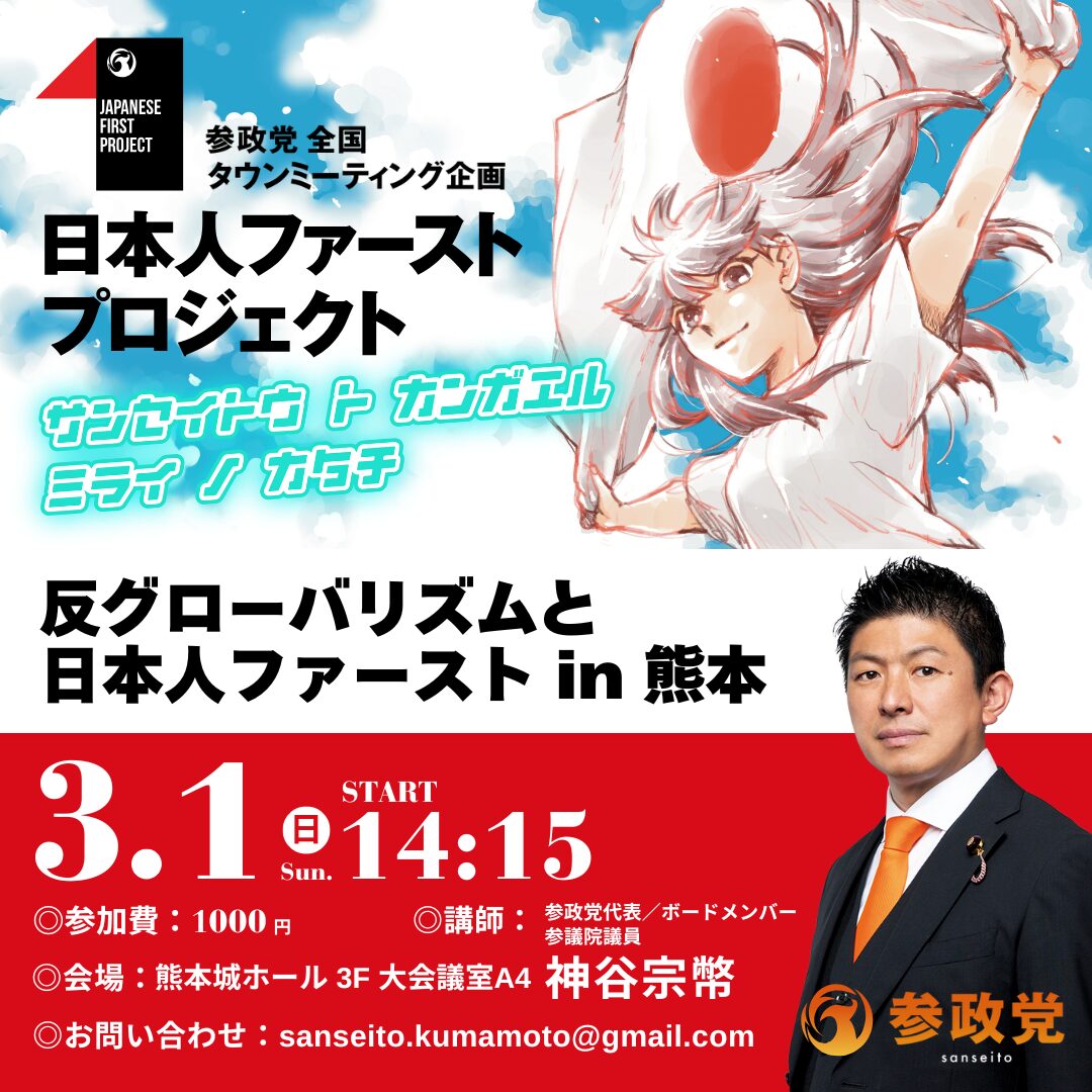 熊本開催!のご案内 【イベント名】 反グローバリズムと日本人ファースト 【開催時間】 14:15~16:15(受付開始13:45) 【会場】 熊本城ホール 3F 大会議室A4 【参加費】 1,000円(18歳未満は無料) […]