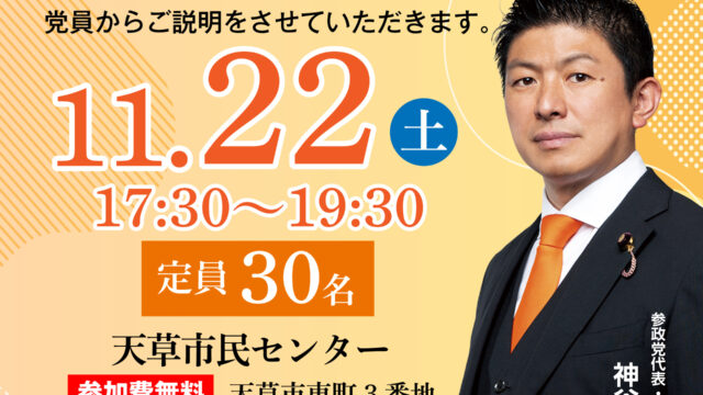 政治活動 天草市議会議員選挙 参政党候補者説明会 このたび、天草市議会議員選挙(令和8年3月執行)に向けた候補者擁立に関する説明会を開催いたします。「天草から地域の未来を... 2025.11.10 政治活動