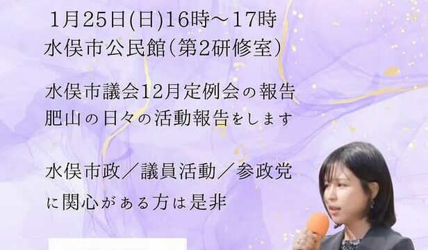 【報告会のご案内】参政党 水俣市議会議員 肥山美緒が報告会を開催しますので是非ご参加宜しくお願いいたします。※予約不要で...