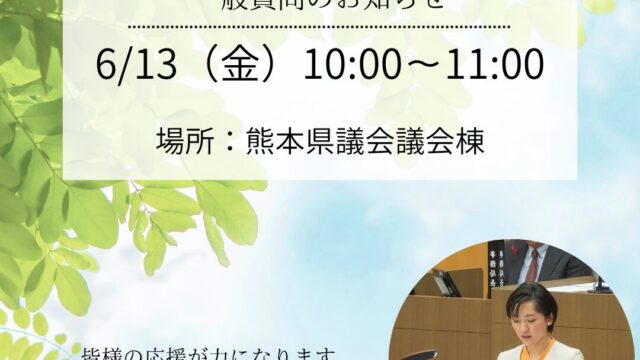 議会 【熊本県議会 6月13日(金)10:00~11:00 】熊本県議会議員 高井ちとせ 一般質問のお知らせ
